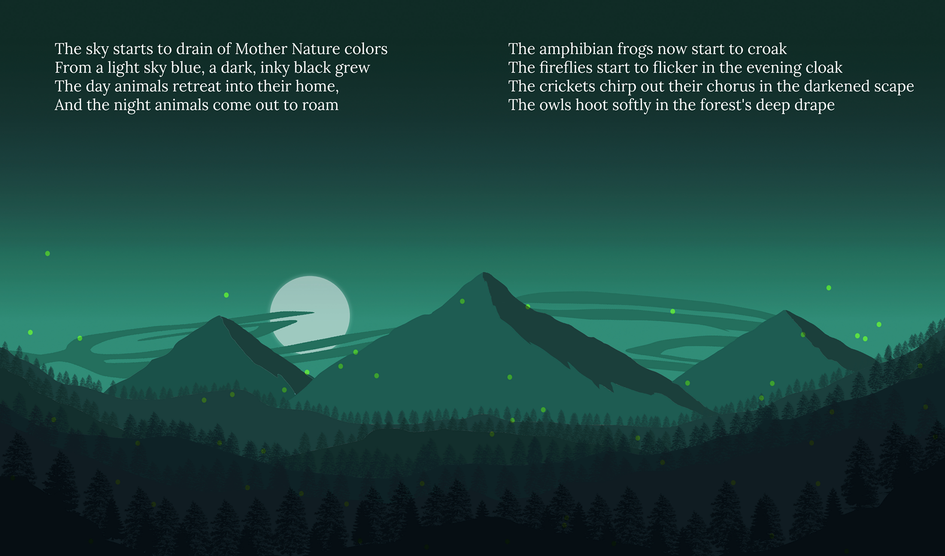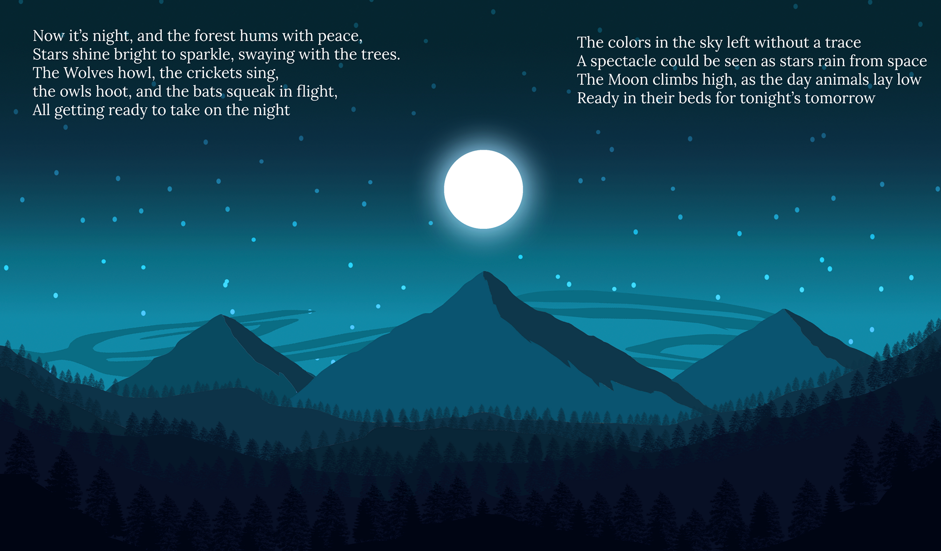 In Spring 2025, a coursework assignment required designing a game, interactive book, or activity for young children. I created a digital bedtime storybook inspired by Goodnight Moon and the atmospheric style of Firewatch. The goal was to blend soothing repetition and goodnight rituals with subtle environmental storytelling, calming visuals, and light interactivity—promoting relaxation while sparking wonder in nature. This project honed my skills in age-appropriate design, simple navigation, soft palettes, and gentle narrative pacing.